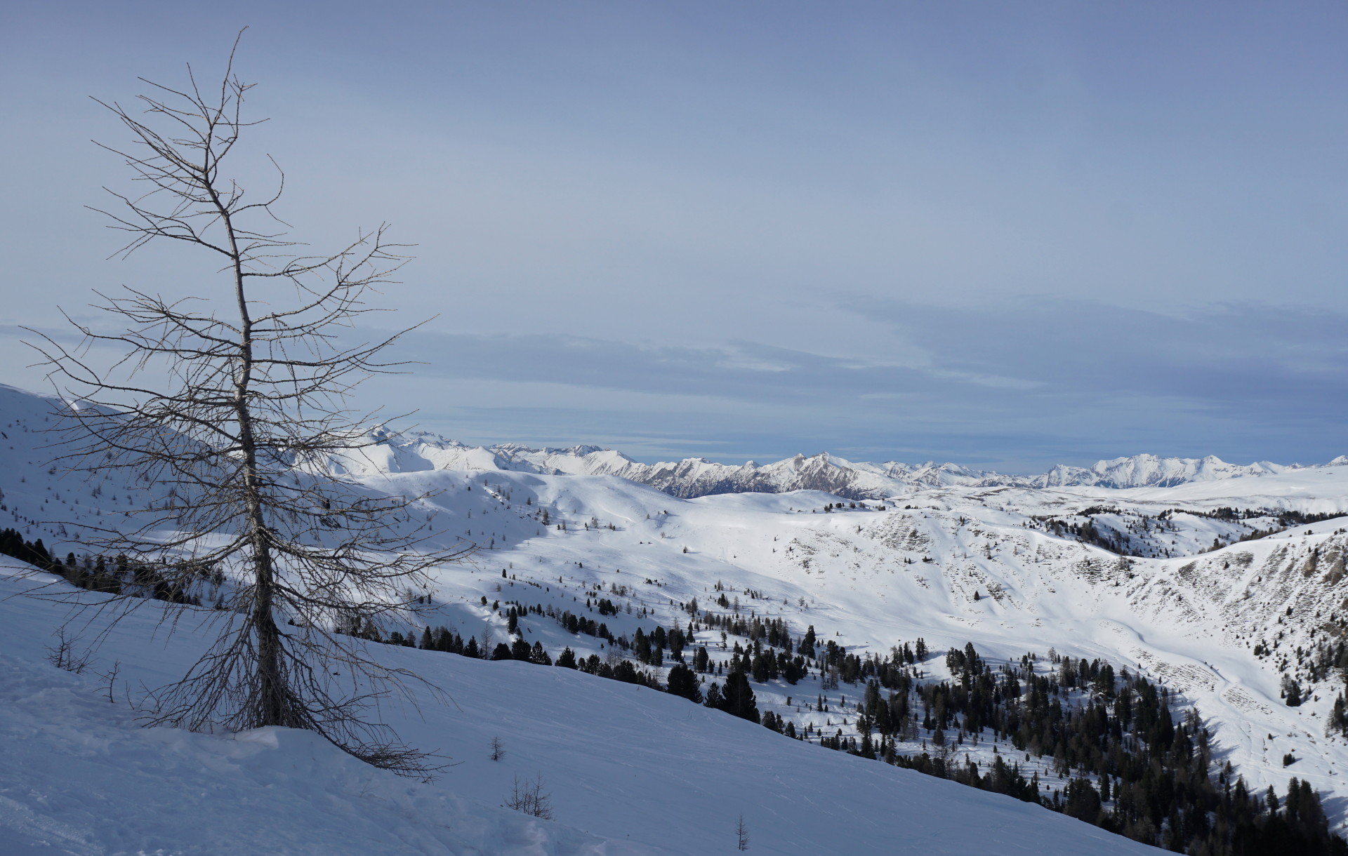 Najboljši del včerajšnje ture je bilo zavedanje, da bo končno konec obupavanja pri iskanju in načrtovanju ture, kjer bi sredi zime lahko našli dovolj snega za “normalno” smučanje. Tokrat smo se vendarle odločili za obisk Nockbergov, ki nekako nikoli niso bili dovolj vabljivi. Iskreno povedano me tudi niso posebno navdušili, saj so vrhovi precej kopasti in neizraziti, tako da tudi razgledi in ambient niso pretirano atraktivni. Verjetno bi bil vtis drugačen, če bi bili gozdovi odeti v belo in bi drveli navzdol v globokem pršiču.
