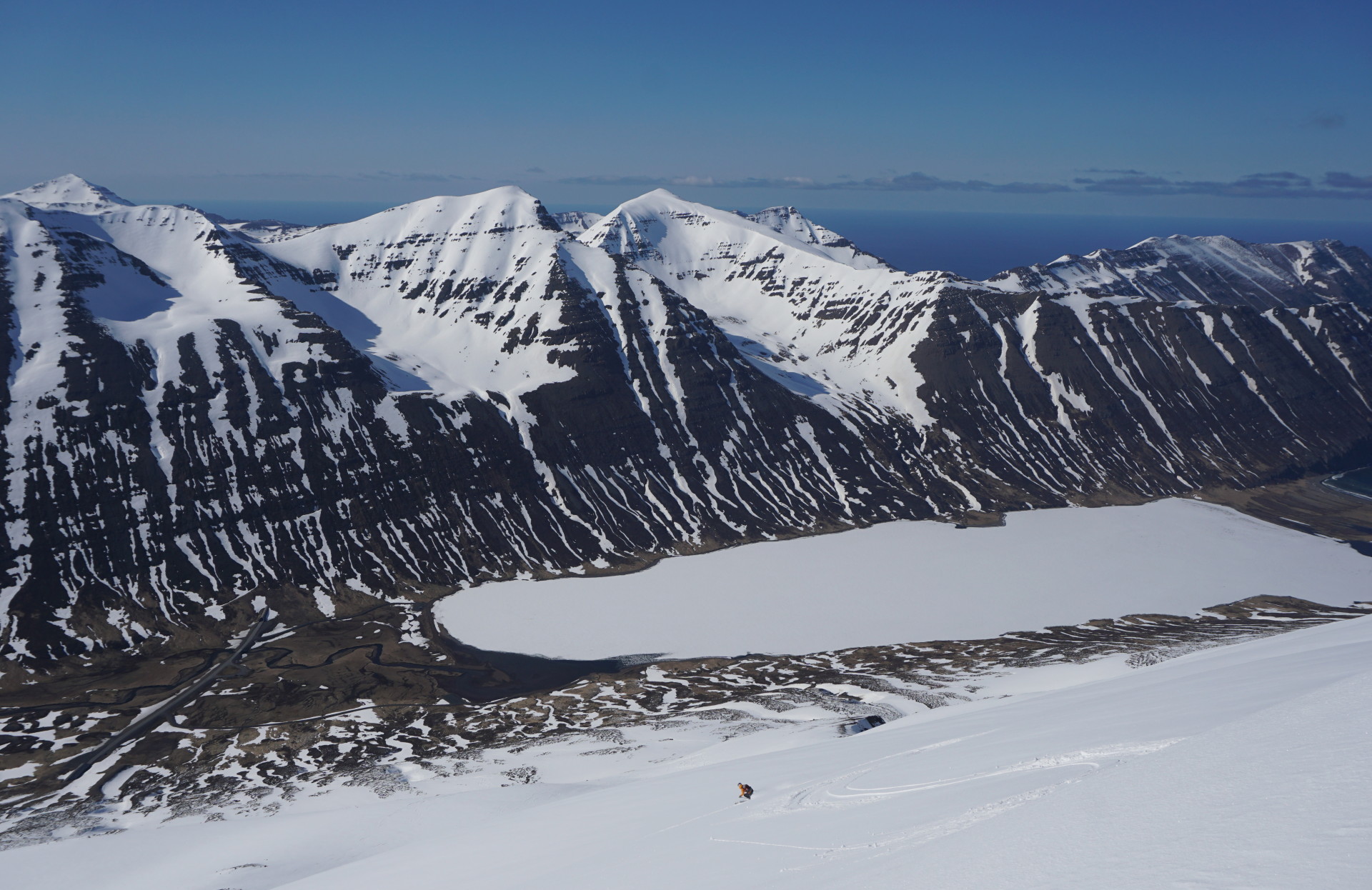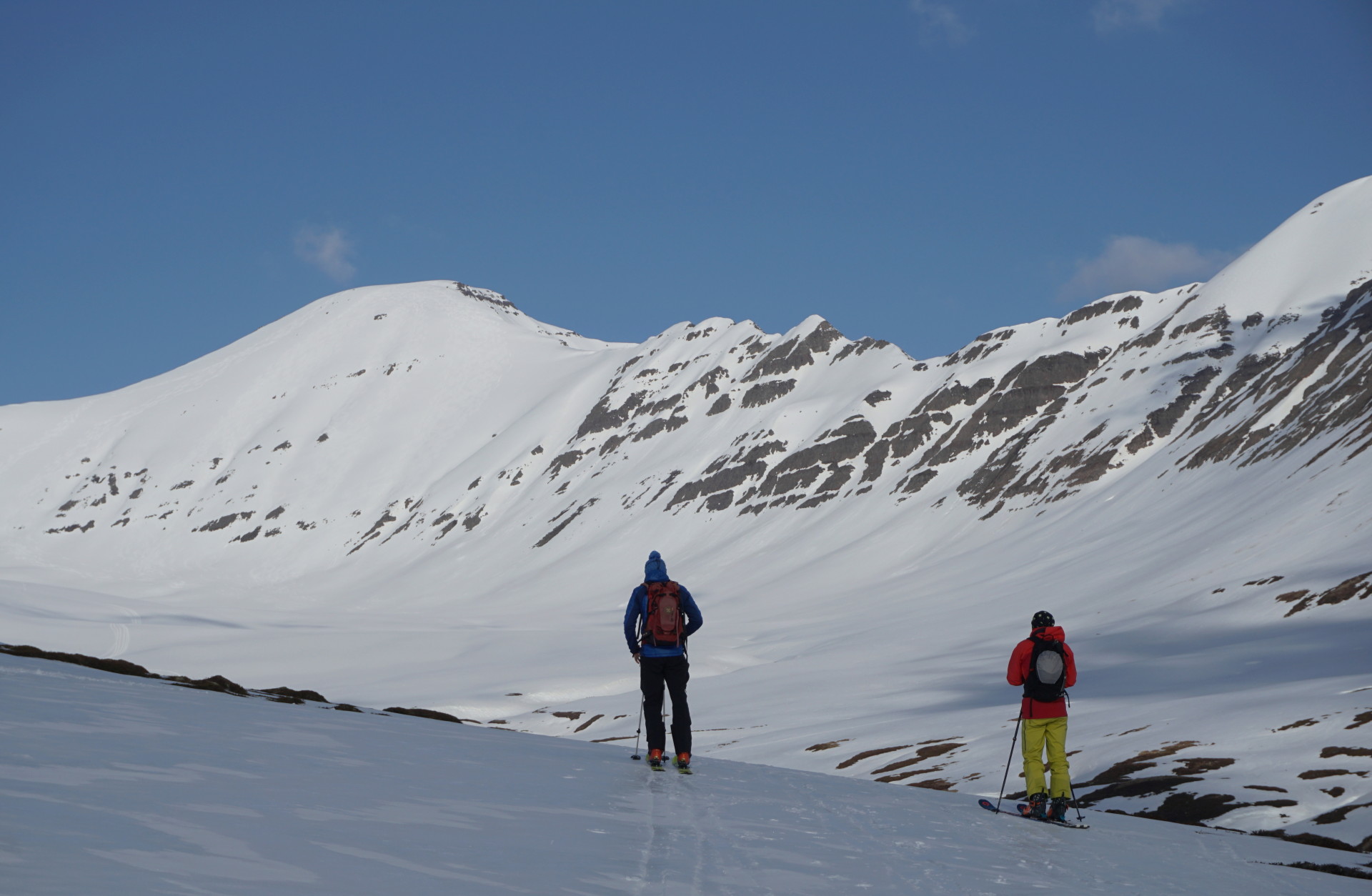 Prvi dan nas je pričakalo lepo vreme, manjkala nam je le še ideja, kam na turo. Zapeljali smo se v bližnjo dolino takoj južno od Dalvika, kamor dokaj daleč vodi ena redkih cest v notranjost in se približa višjim hribom (tam sežejo do okoli 1300 m). Nekoliko presenetljivo je bilo tam manj snega kot na nekaterih nižjih hribih tik ob morju. Tudi sicer nisem doumel tamkajšnje logike: v eni dolini skoraj kopno, v sosednji lepo zasneženo, in tako podobno naprej. Kakorkoli, ta dan smo se vrnili v Dalvik in parkirali pod smučiščem (gre zgolj za majhno lokalno smučišče z dvema vlečnicama).