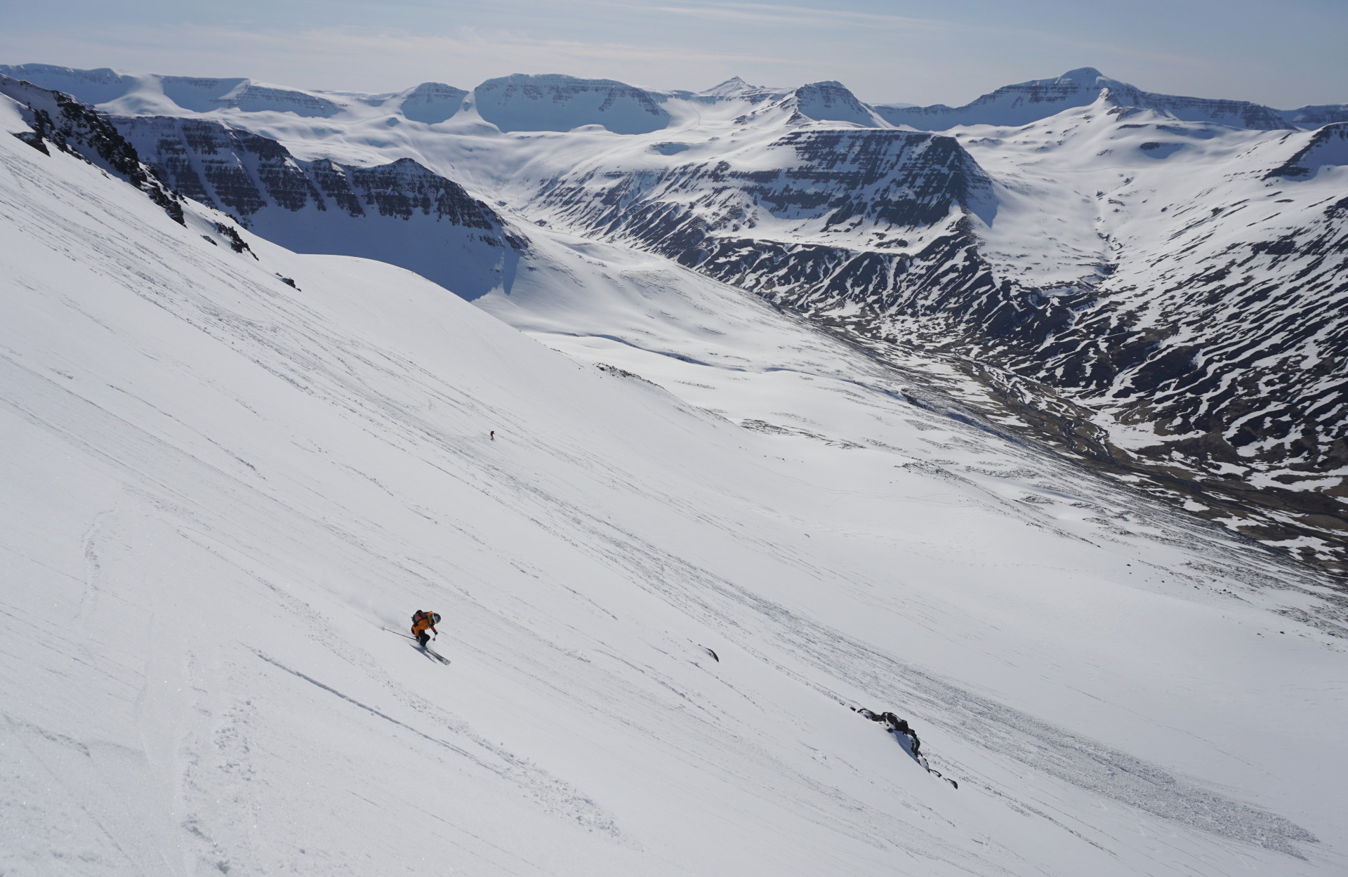 Spet smo se zapeljali v Olafsfjordur in parkirali tik nad prvim tunelom. Tokrat smo morali nekaj minut nesti smuči do začetka snega, nato pa kar naravnost gor in na koncu levo do vrha. Morda se sliši malce dolgočasno, vendar smo ves čas hodili preko širnih pršičastih pobočij. Tudi ta dan je bilo dopoldne oblačno, med smučanjem pa se je zjasnilo in nad zadnjim žlebom smo se obrnili in ponovili zgornji del. V žlebu spodaj smo ujeli snežni jezik in z enim kopnim prehodom pripeljali do avta. Skratka, odlično.