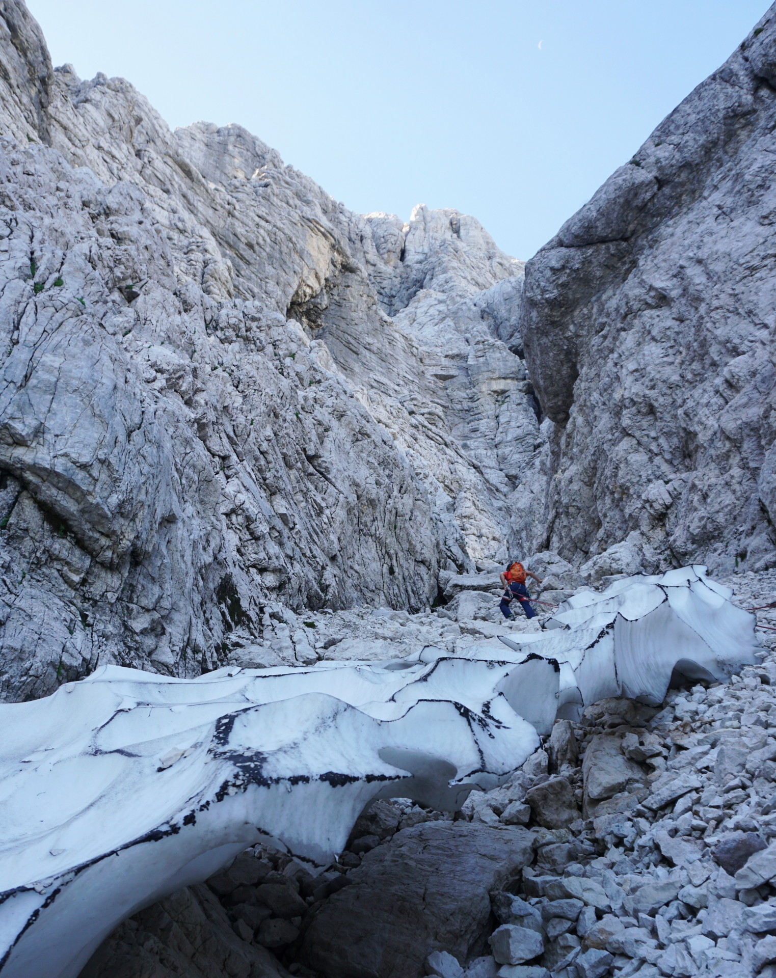 Zdi se, da se nam želi september oddolžiti za letošnje poletje in dnevi so idealni za potepanje po hribih. Soboto smo z Džanijem in Zoranom izkoristili za obisk Stene, v kateri smo preplezali starodavno klasiko, ki sliši na ime Kratka Nemška – gre za kombinacijo Nemške smeri z izstopom Zimmer-Jahn (IV-/II-III, 800 m), obe sta bili preplezani že leta 1906. Če odmislimo Slovensko smer, ki so jo že konec 19. stoletja “mimogrede” preplezali trentski lovci, je bila Nemška prva “uradna” smer v Steni, kar je bil takrat seveda velik dosežek. Danes predstavlja enega najlažjih prehodov preko naše najmogočnejše stene, ki je od blizu vse prej kot zgolj monoliten zid: sestavljajo jo namreč številne grape, stebri, stolpi, police … vzpon je torej pravo doživetje v nadvse veličastnem okolju.