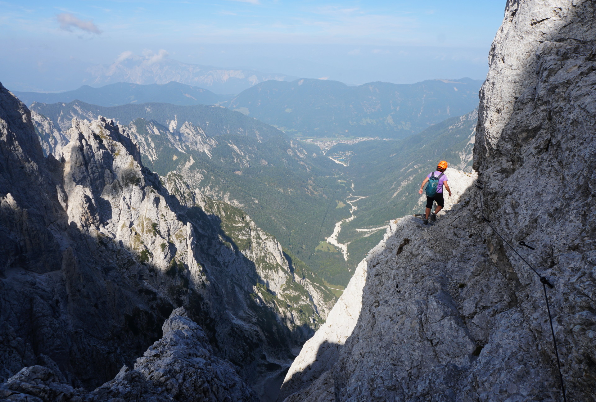 Začela nisva prav zgodaj – pa tudi ne najbolje, saj sva že takoj zgrešila pot in se vzpenjala po strugi skoraj do pod slapov. K sreči ni daleč nazaj in po strmem pobočju do vstopa v Hanzovo pot. Začne se s strmim vzponom čez skalno stopnjo, nato pa se vije po policah, okoli robov, stolpov in grap, preko več skokov, celo skozi macesnov gozdič in preko travnatih pobočij – ves čas v neverjetno divjem okolju severnega ostenja, ki pritiska s svojo mrakobnostjo, medtem ko na oni strani sijejo sončni grebeni.