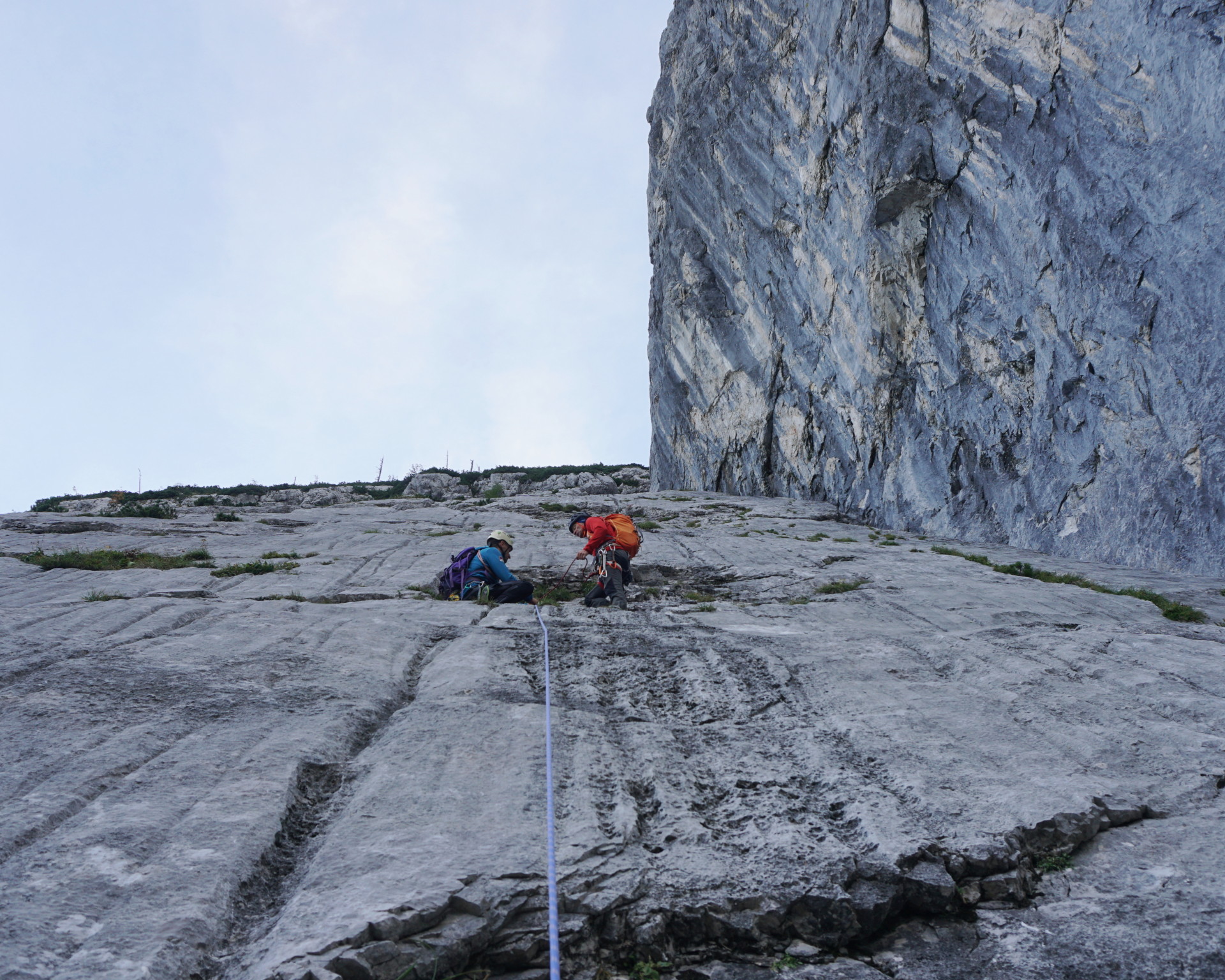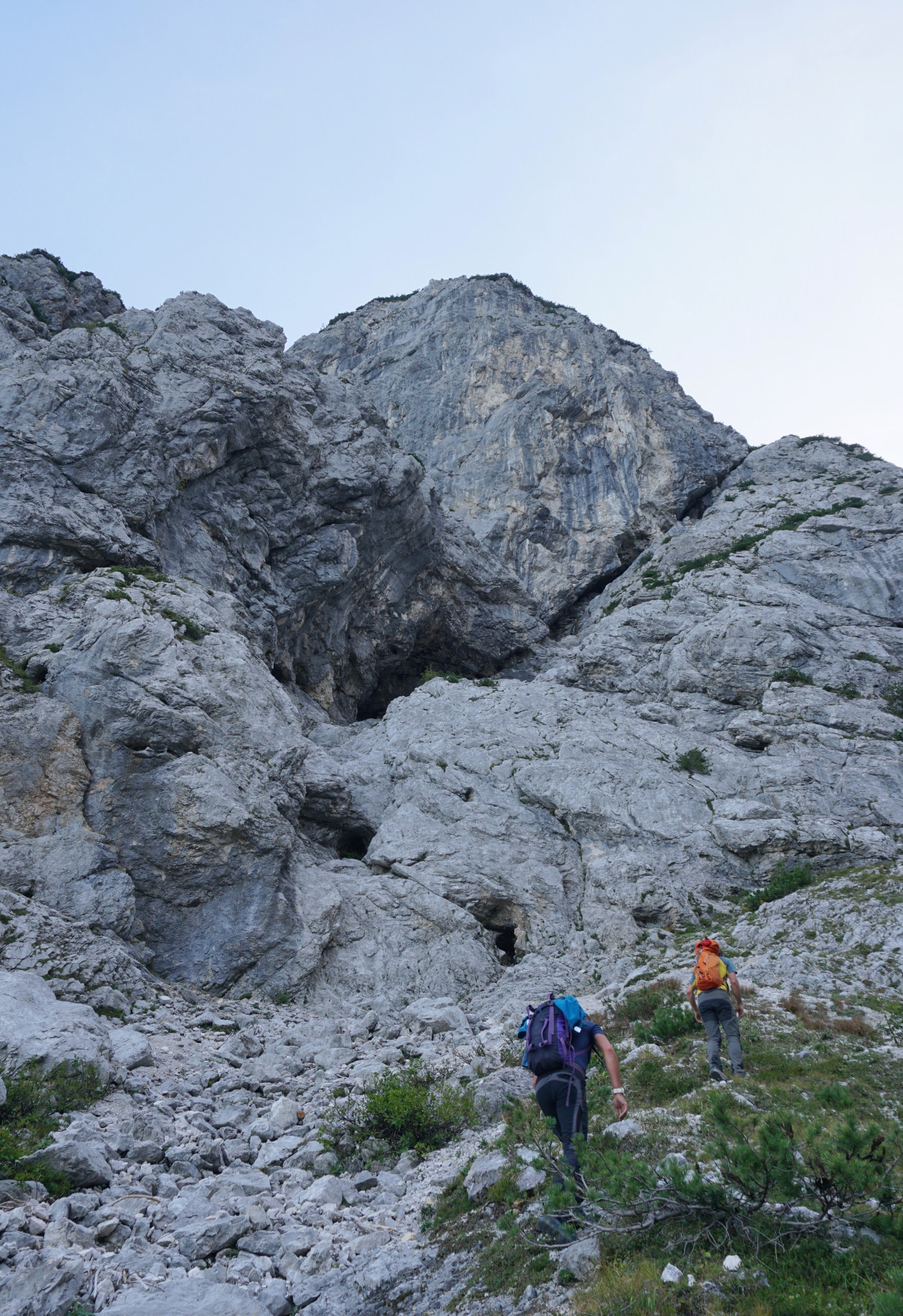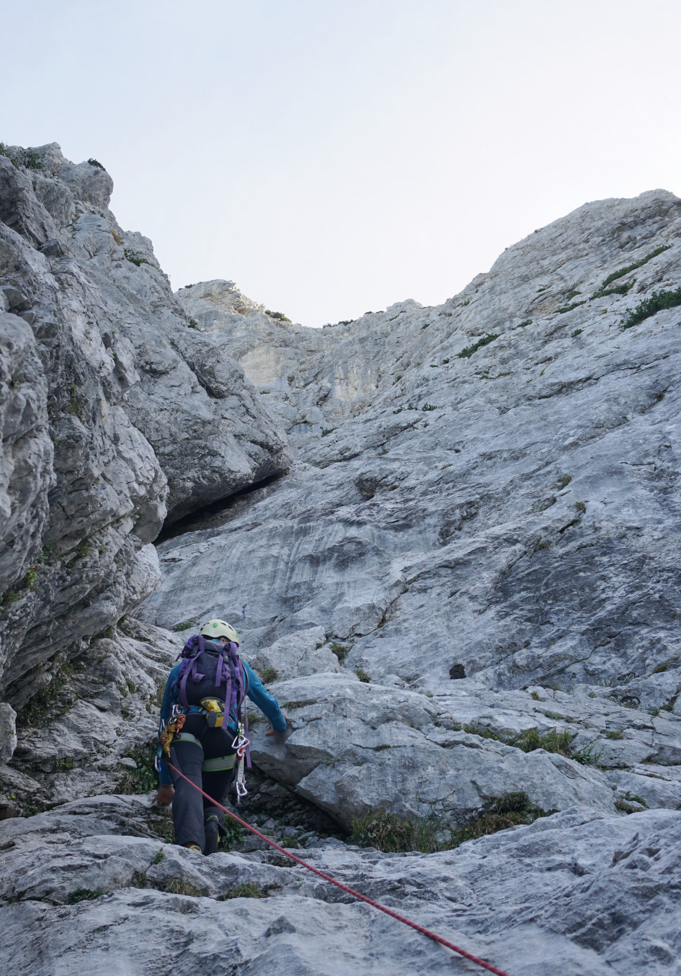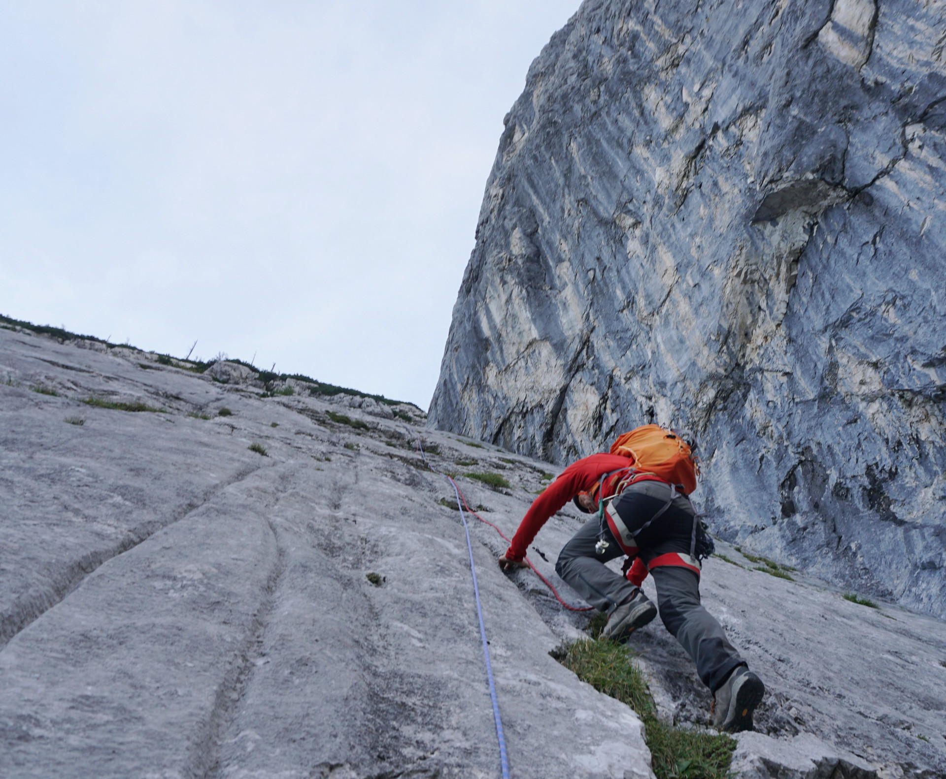 Zjutraj se nam ni mudilo, čeprav se je kmalu izkazalo, da nas ne bo zeblo, saj je bilo že po kratkem vzponu občutno topleje kot na dnu doline. Do vstopa smo šli po lovski poti, nato preko zoprnega grabna, med rušjem in po strmem skrotju do vznožja stene. Za ogrevanje nekaj poplezavanja do votline in za robom do prvih plošč. Zahodna stena Babe od daleč morda ne izgleda posebno atraktivno, a naša smer sledi lepim monolitnim ploščam in nekaj vmesnim kaminom, skorajda povsod v dobri skali. Plezanje je dokaj konstantno in enakomerno težavno, mestoma na kakšni gladki plošči nekoliko nelagodno, saj plezaš na trenje. No, jaz sem tu plezal kot drugi, tako da mi je bilo precej lažje. Le v zadnjem delu, ko je plošč in kaminov konec, je skala nekoliko bolj krušljiva preden se smer izteče v ruševje. Od tam ni daleč do markirane poti tik pod vrhom Babe.