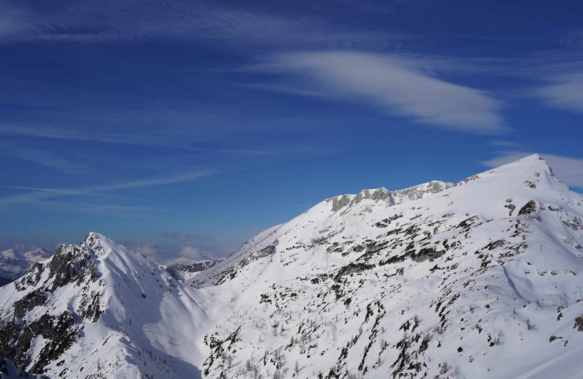 Dva Avstrijca pred nama sta potegnila lepo špuro, pod škrbino smo šli peš in še naprej po kopnem grebenu. Mala Mojstrovka je bila videti super, saj je pobočje rahlo jugozahodno. Kljub temu sva odvila levo in na samotno Veliko Mojstrovko, kjer je lepši razgled – tudi na polno in glasno Planico. Novi sneg je bil že južen, a ga ni bilo veliko, tako da je bil spust prav fajn naravnost proti Drevesnici. Spodaj je snega že zelo malo in med rušjem sva pripeljala ravno do prečne lovske poti na 1500 m, kjer je smuke konec. Tisti vzpon nazaj na Vršič je seveda rahlo odveč, ampak sonce se je že skrilo za oblake in zaključila sva prav zadovoljna z dobrim izkoristkom dopoldneva.
