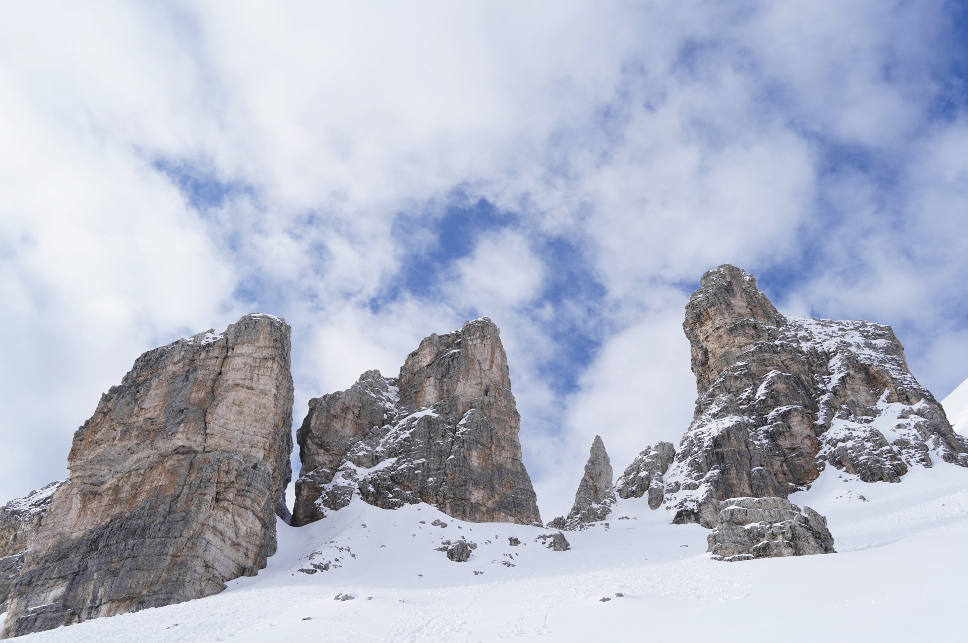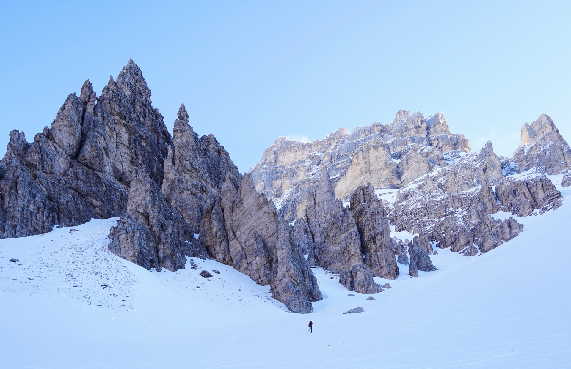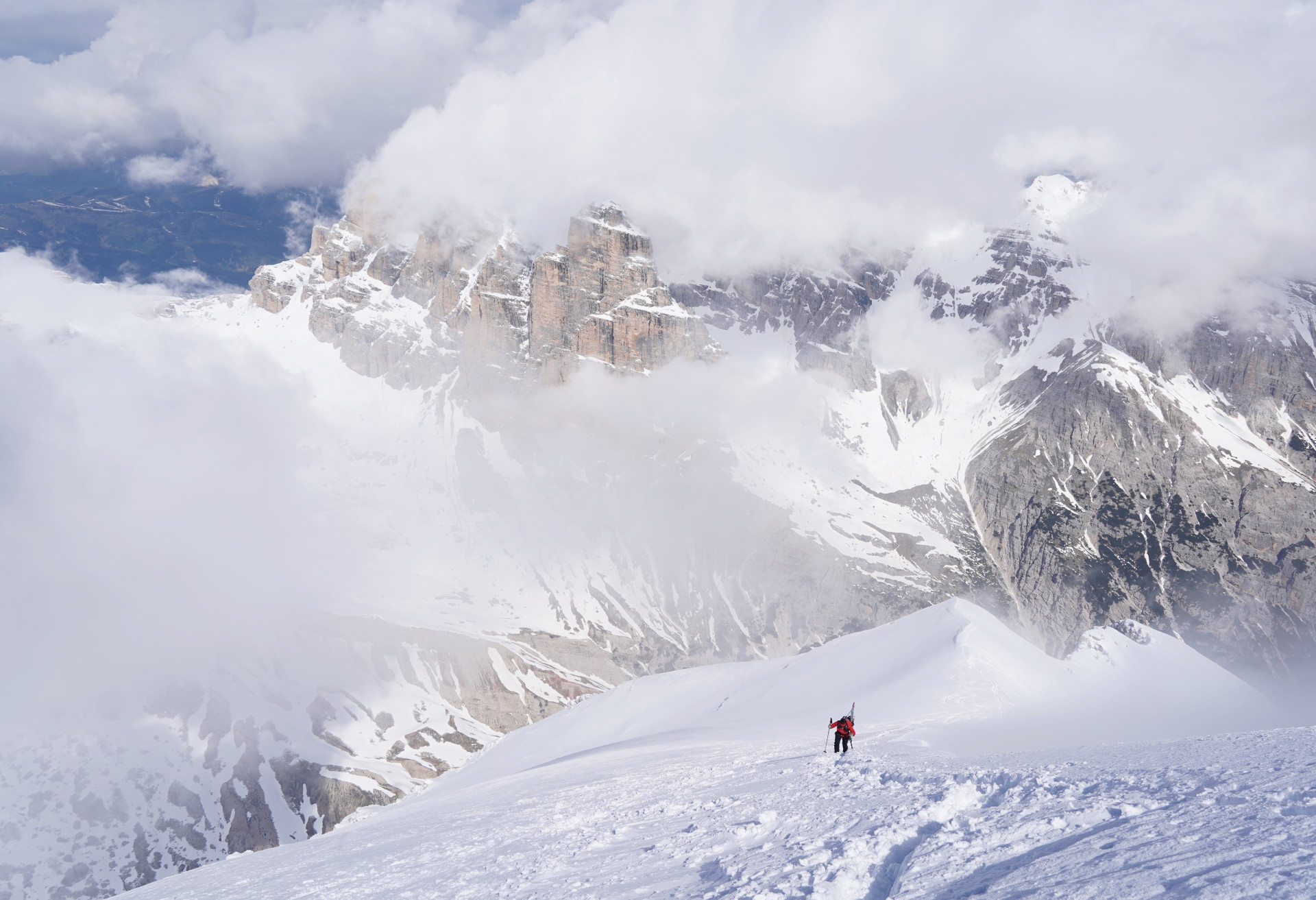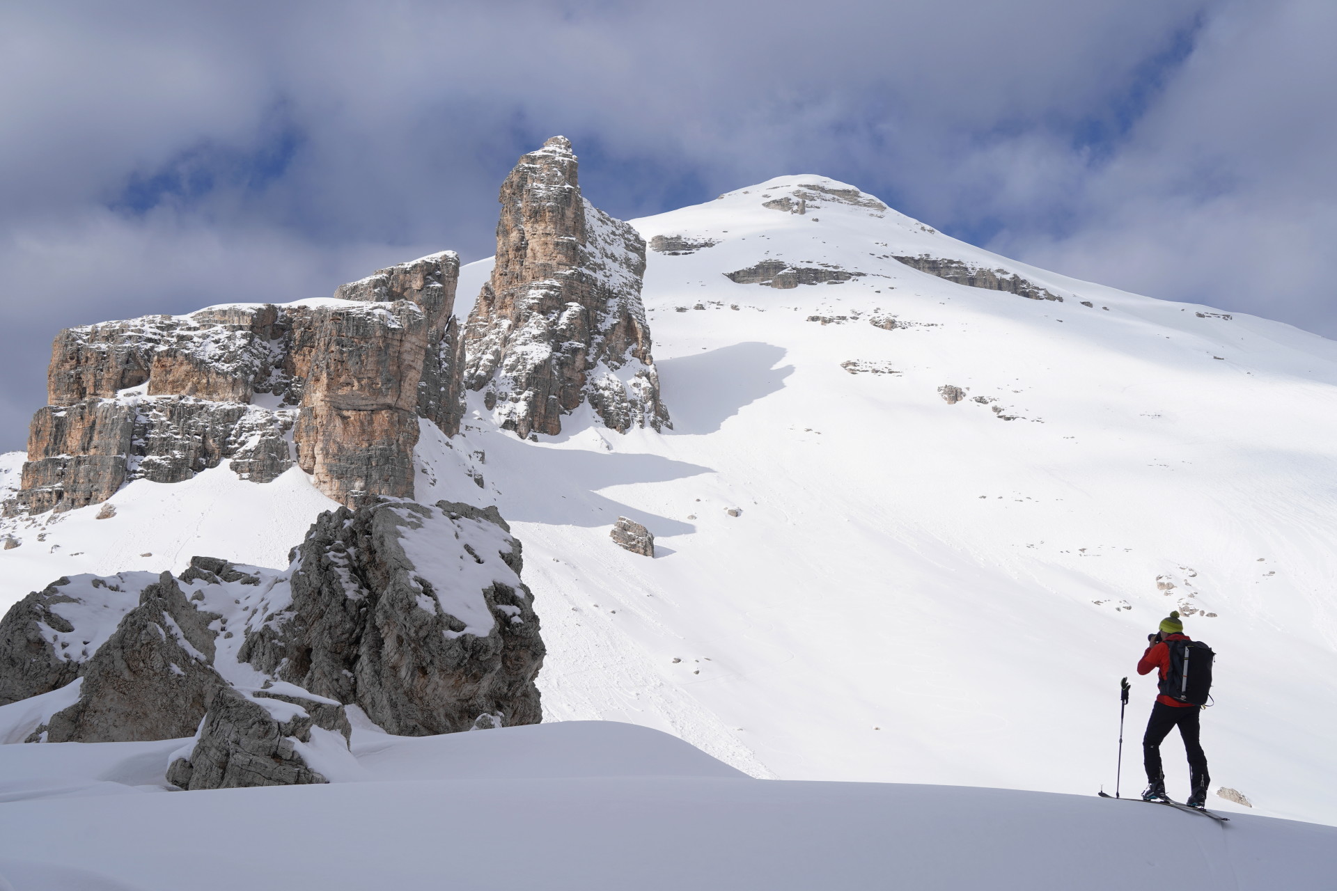 Vzpon v splošnem ni veliko obetal. Jutro je bilo sicer krasno in kar neobičajno hladno. Na izhodišču pri Rifugio Dibona (2037 m, trenutno zaprta) sva se že spraševala kje neki bova smučala. No, za robom se odpre lepa dolina in po pol ure hoje sva nadaljevala na smučeh. Skozi slikovit prehod med stolpi in špicami sva dosegla Rifugio Giussani (2600 m), od koder se odpre pogled na obsežno pobočje proti vrhu. Tu je sledilo novo razočaranje: med tednom je padlo nekaj snega, ki se je splazil s skalnih pragov in celo pobočje je bilo polno (sicer mehkih) kep. To pa ne bo nič kaj prijetno smučati. Poleg tega se je kljub zgodnji uri že začelo oblačiti …
