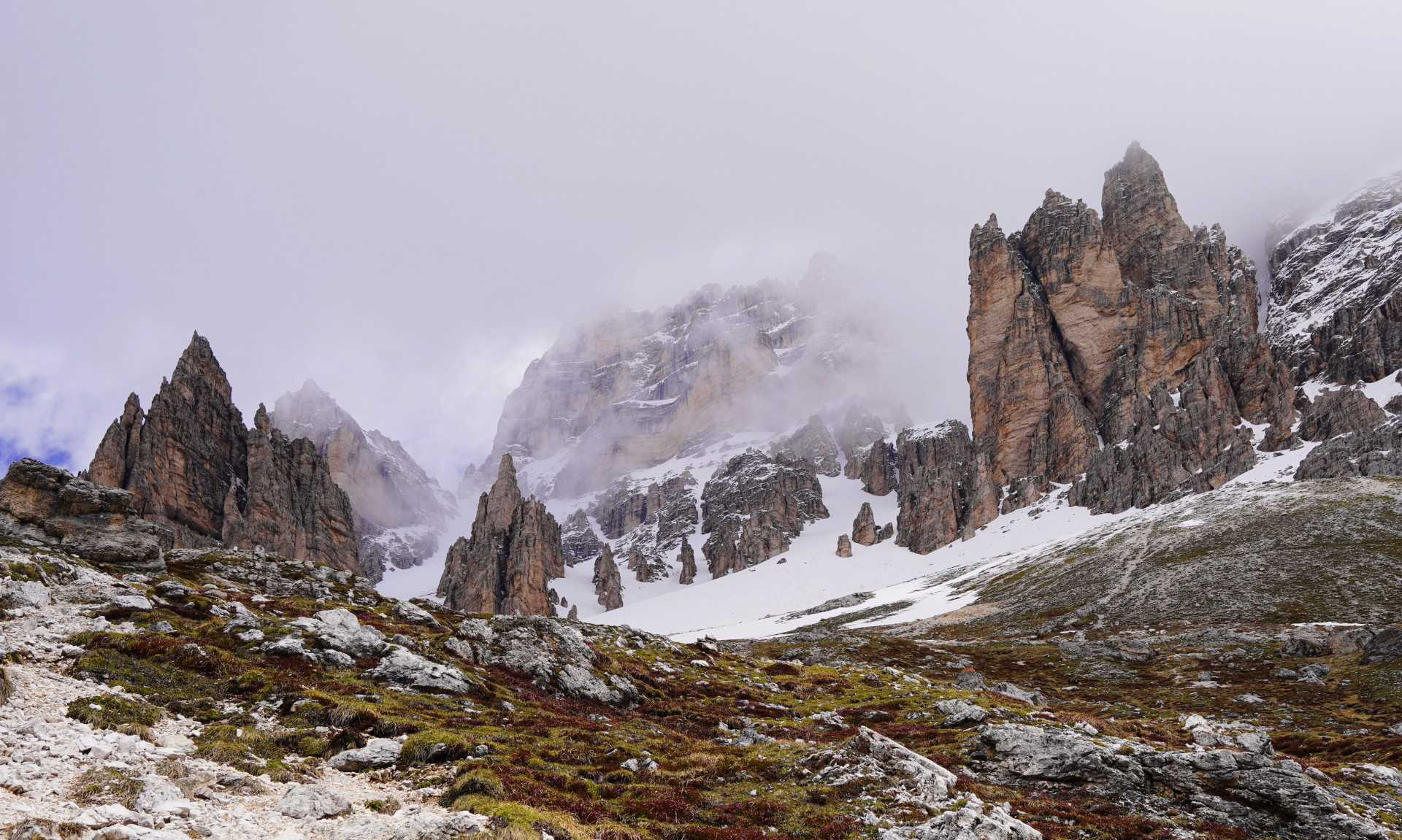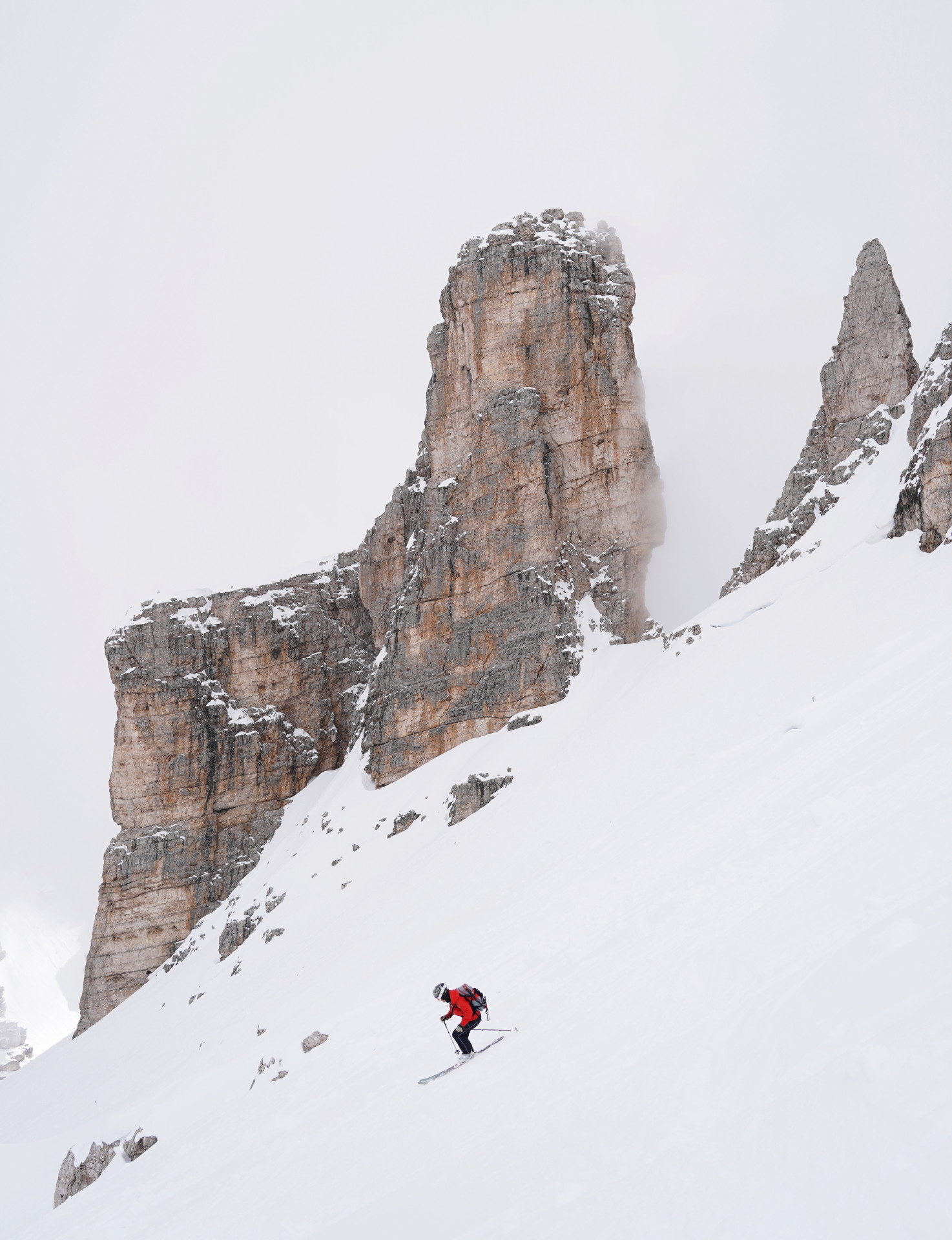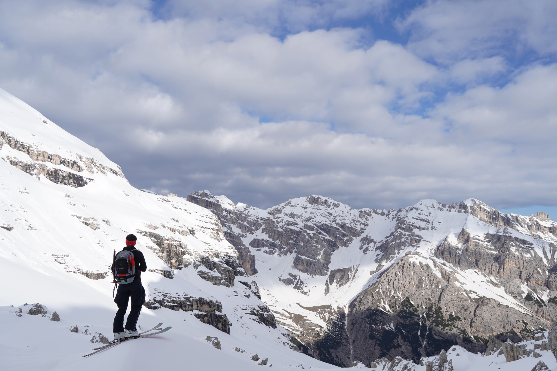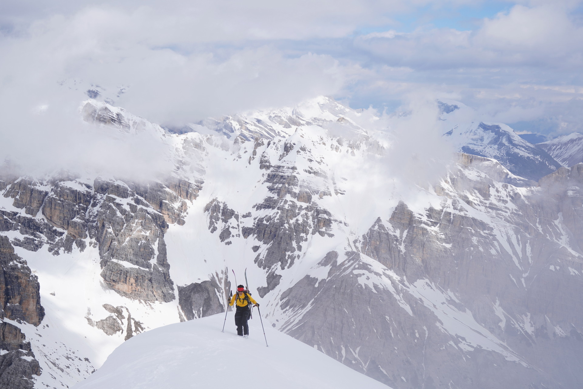 Vzpon v splošnem ni veliko obetal. Jutro je bilo sicer krasno in kar neobičajno hladno. Na izhodišču pri Rifugio Dibona (2037 m, trenutno zaprta) sva se že spraševala kje neki bova smučala. No, za robom se odpre lepa dolina in po pol ure hoje sva nadaljevala na smučeh. Skozi slikovit prehod med stolpi in špicami sva dosegla Rifugio Giussani (2600 m), od koder se odpre pogled na obsežno pobočje proti vrhu. Tu je sledilo novo razočaranje: med tednom je padlo nekaj snega, ki se je splazil s skalnih pragov in celo pobočje je bilo polno (sicer mehkih) kep. To pa ne bo nič kaj prijetno smučati. Poleg tega se je kljub zgodnji uri že začelo oblačiti …