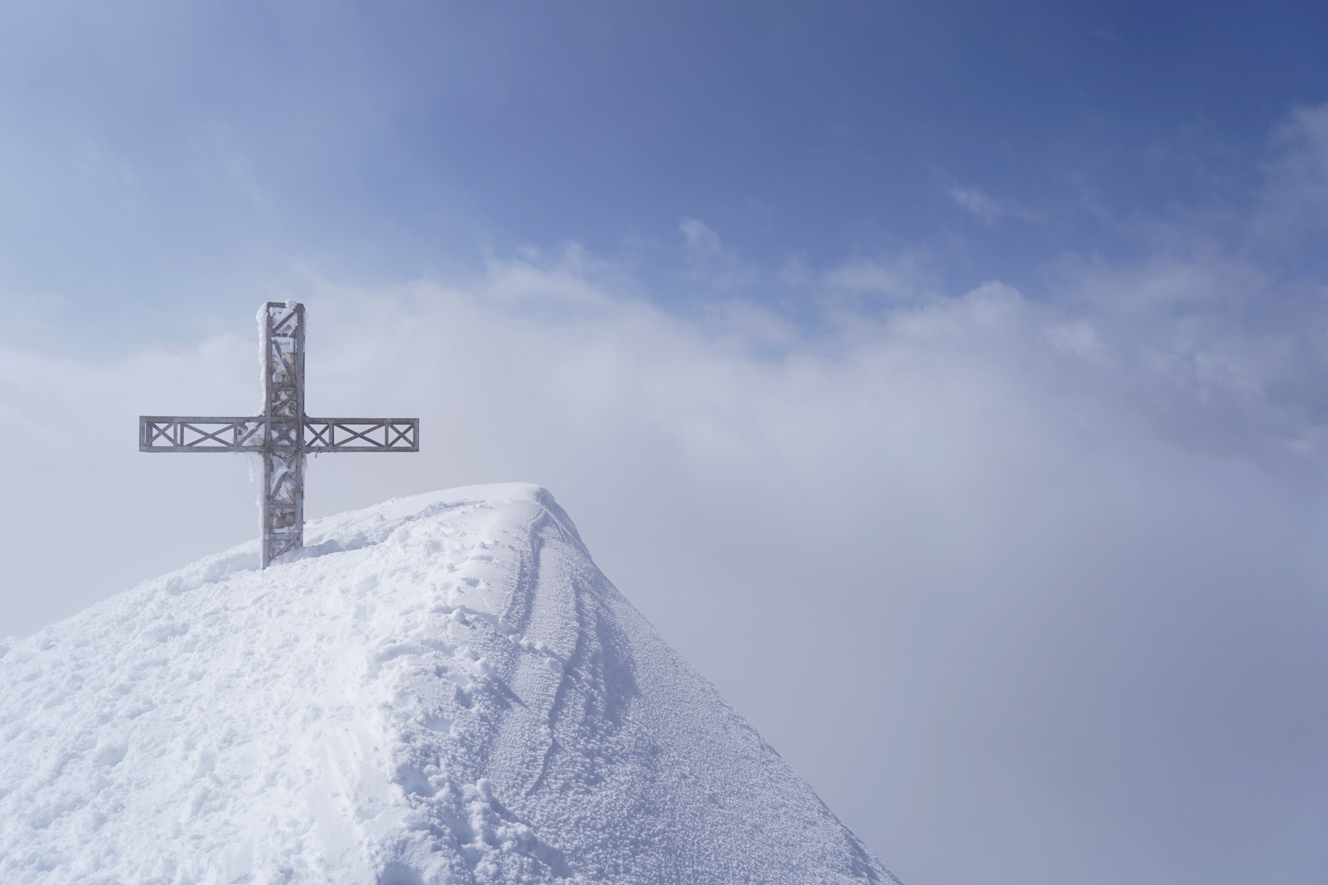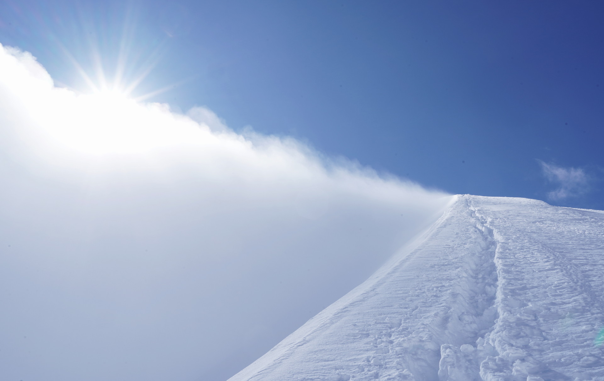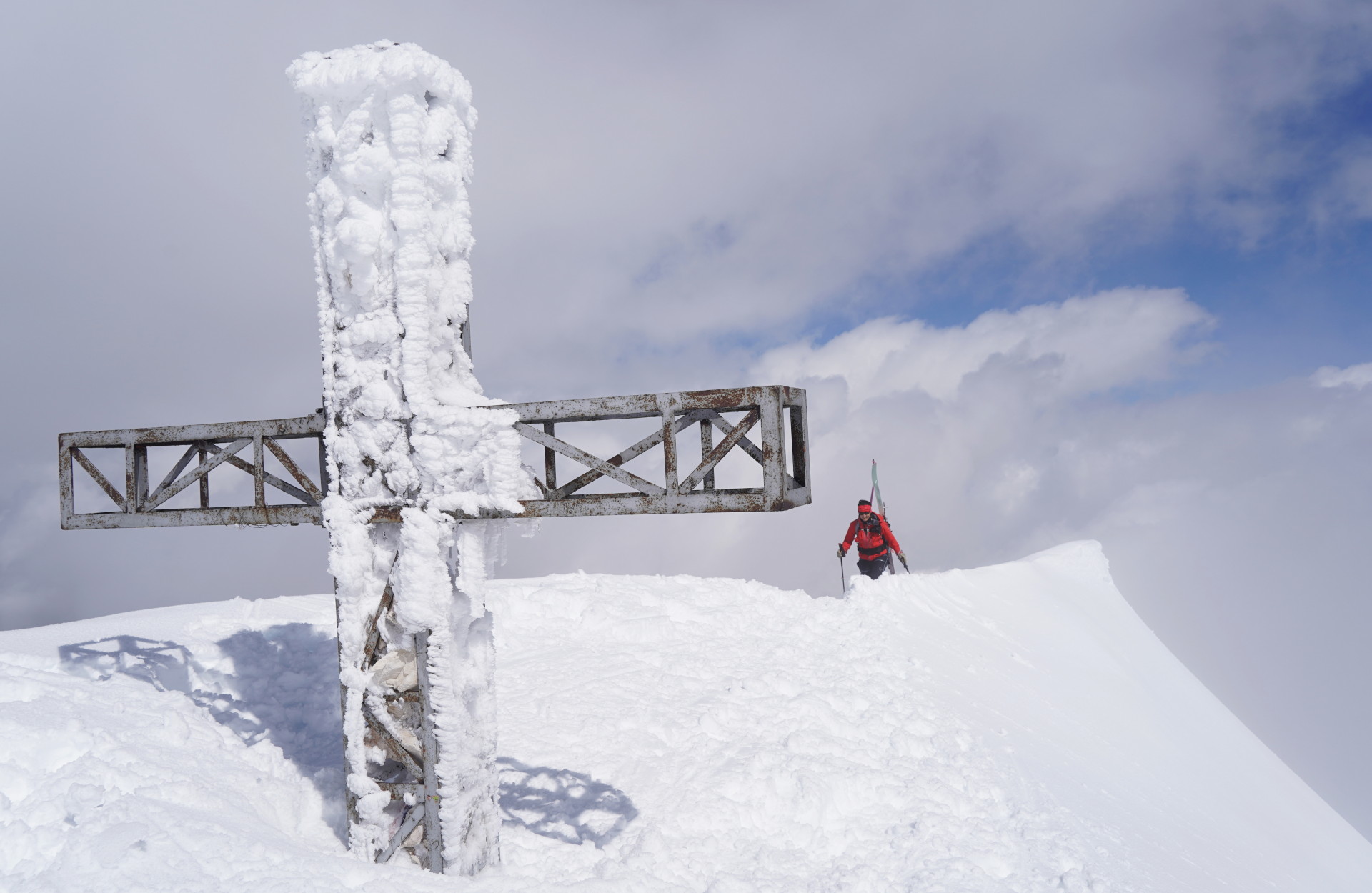 Vseeno sva nadaljevala strmo in vztrajno navzgor ter proti desni, kjer ni bilo plazovin, sčasoma dosegla greben. Tam naju je pozdravil veter, da ni bilo nič kaj pomladno – vendar pa je veter tudi pridno razpihoval oblake. Do vrha sva šla peš, že precej boljše volje sredi atraktivne predstave sonca in oblakov. Razgledi so bili seveda omejeni, kar je škoda na tako mogočnem vrhu.