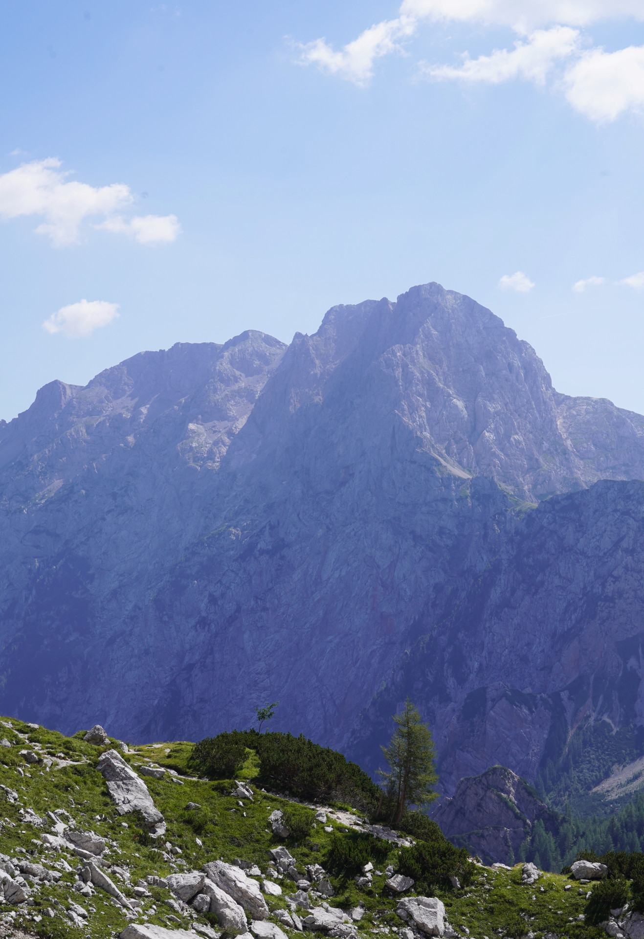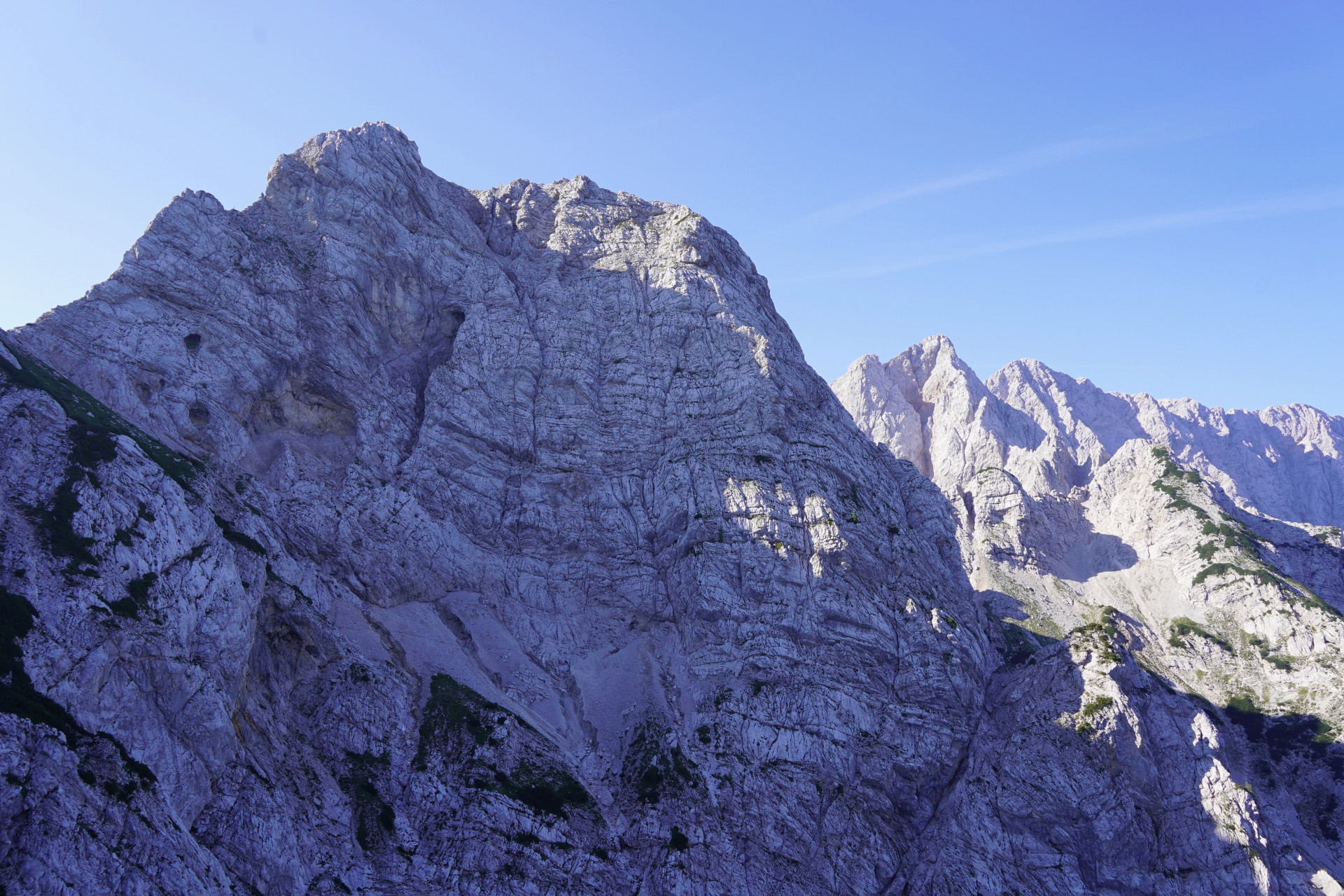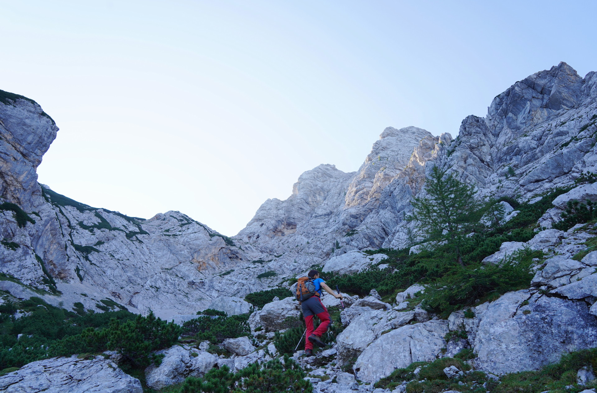 Iz krnice sva vstopila v precej gruščnato grapo, kjer je bilo celo nekaj zbledelih rdečih pik. Nad grapo bi morala prečiti desno in po zgornji grapi bi prišla prav pod vrh Krničke gore. Midva pa sva nadaljevala v bolj strmem terenu, nekaj metrov po skalah in skozi pas rušja, višje pa po travah do grebena tik nad škrbino nad Matkovo krnico. Ne ravno najlepši prehod, a na grebenu sem bil na poznanem terenu, saj sem pred leti prečil vse od Pavličevega sedla do Mrzle gore. Nad škrbino je treba splezati v krušljivem terenu (II) za rob, nato pa po lepem grebenu do vrha Krničke gore, s katere se odpre lep in neobičajen razgled.