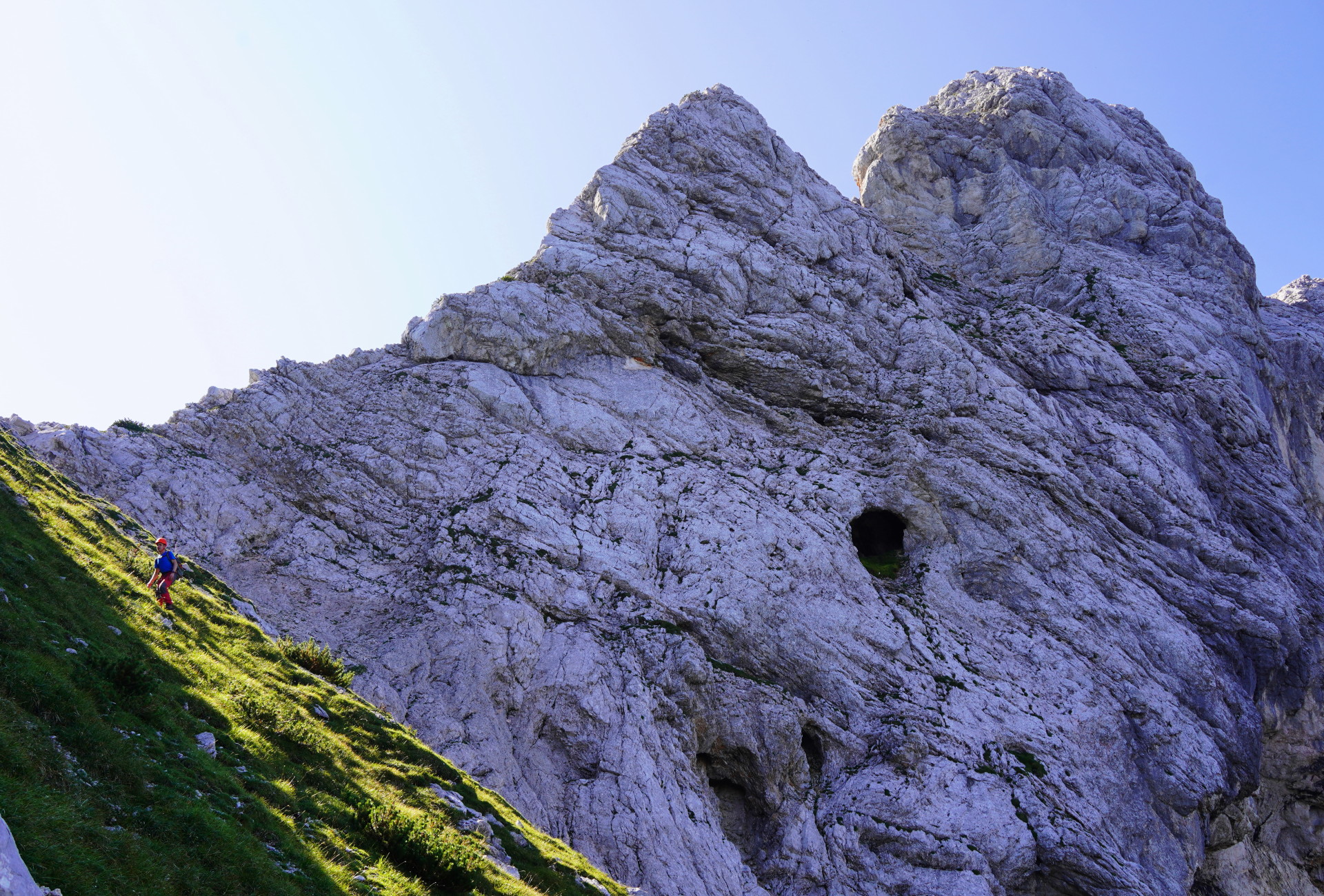 Vroče in stabilno vreme še kar vztraja, zato se je zdel vzpon na Mrzlo goro nekako primeren. Belska Kočna je še vedno bližje kot se zdi, a še vedno ostaja odmaknjena in samotna. Z Maretom sva se tokrat namenila poiskat prehod na Krničko goro preko navidez nedostopnih strmali. Markirana pot se hitro dvigne nad skalni skok, kmalu za izvirom osvežilne vode pa naju je možic povabil na skromno stezico, ki sva ji (tudi s pomočjo številnih možicev) brez težav sledila v sicer slabo preglednem terenu do skrite krnice pod Krničko in Mrzlo goro. Prav navdušena sva bila nad prvinskim ambientom med stenami.