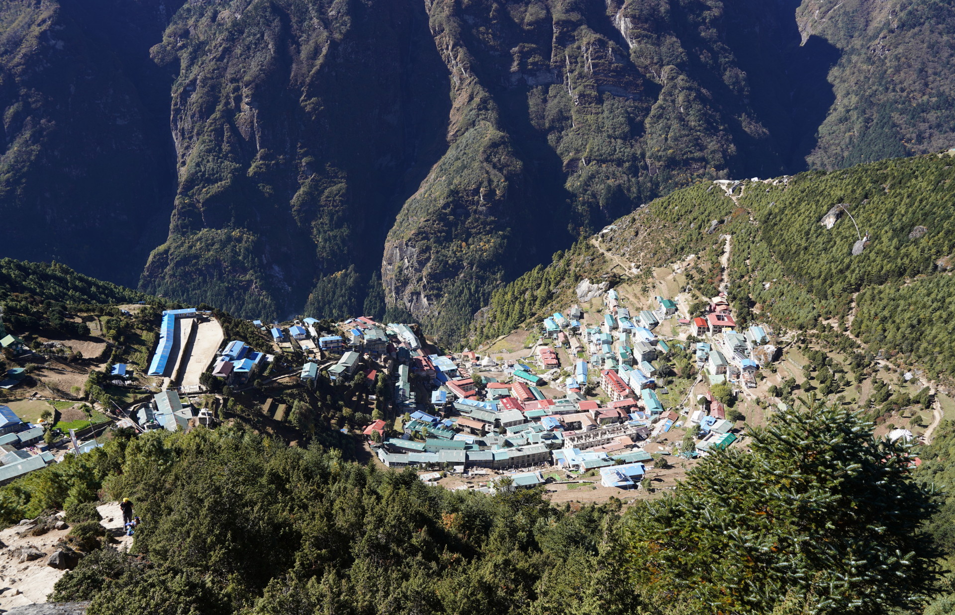 Dan počitka je bil seveda namenjen aktivni aklimatizaciji in v resnici smo opravili kar dolgo krožno turo z nemalo vzpona. Kot (skoraj) vsak dan smo se zbudili v povsem jasno jutro in šele zares opazili okolico, ki je bila ob prihodu že skrita v oblakih, ki so se kot (skoraj) vsak dan popoldne nabrali z juga. Celo mesto je zgrajeno v strmem pobočju, tako da so vse ulice pravzaprav same stopnice. Nad mestom smo najprej obiskali spominski park Tenzinga Norgaya. Poleg je tudi muzej, ki pa ga nismo zares zaznali, saj stoji na razgledni točki, s katere se v daljavi pokažejo Everest (za grebenom Nuptseja), Lotse in Ama Dablam.