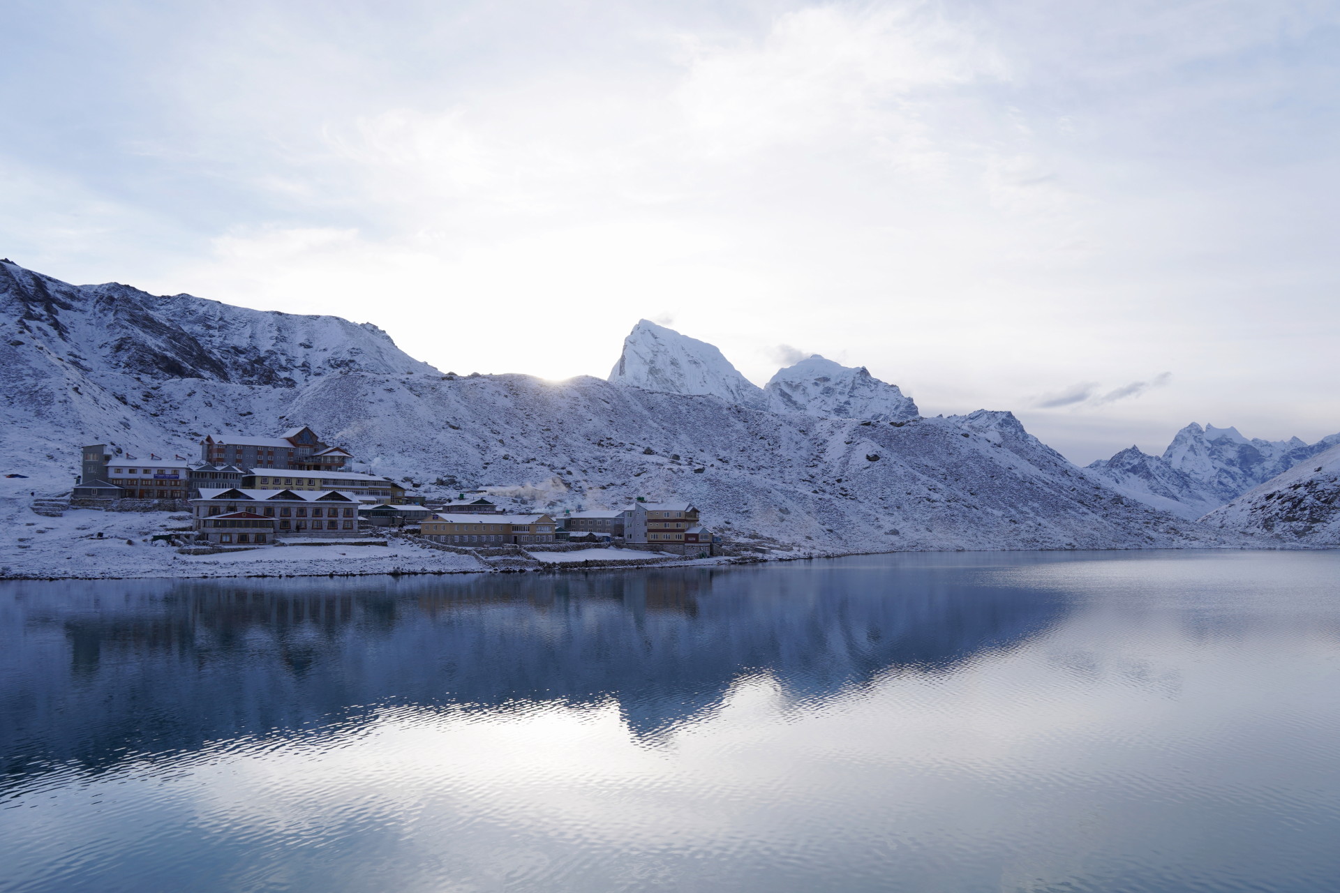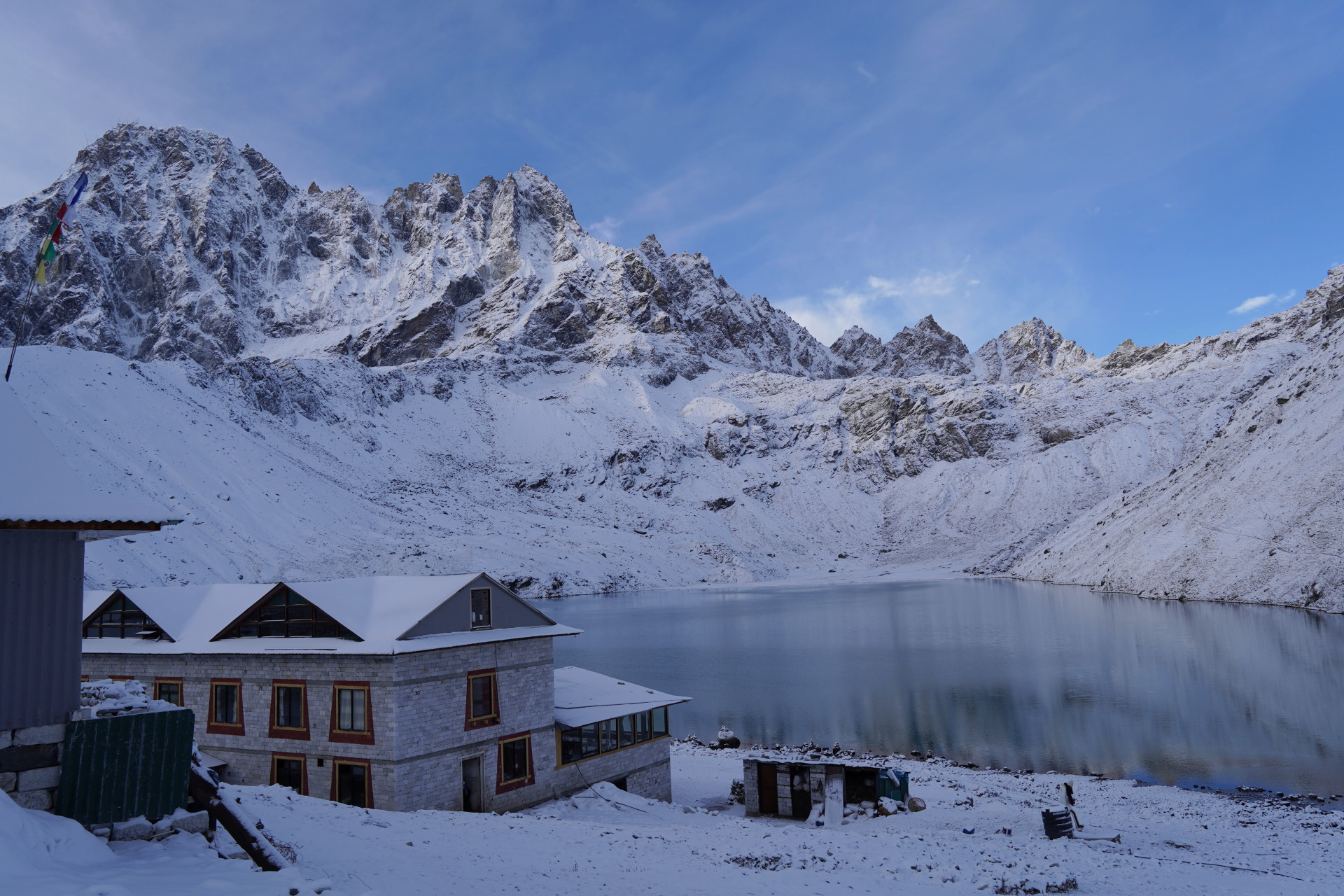 Pobočje na drugi strani je zelo strmo – a vse do jezera 400 metrov nižje so zgrajene široke stopnice in spust tudi v snegu ni bil težaven. Sledi zložen sestop, menda prvi (in edini!) na celi poti brez večjega vmesnega vzpona. Nižje smo preko strmejšega praga dosegli dolino reke Bhote Kosi in kmalu nato prvi zaselek, kjer smo prenočili v enem slabših lodžev. K sreči ni več daleč do bolj priljudnih krajev.