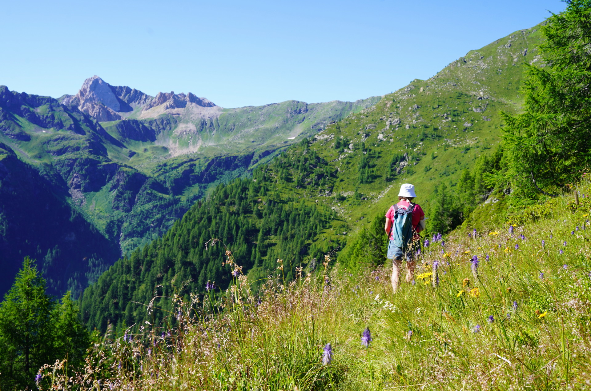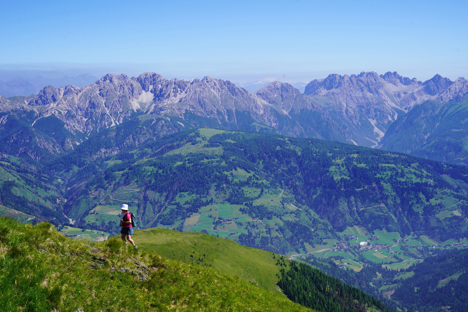 Naslednji dan smo se zapeljali naprej po dolini do vasi Maria Luggau in preko zaselka Raut še kakšnih 100 m višje po slabši gozdni cesti. Glede na karto smo si obetali vzpon v gozdu, a je zaradi vetroloma pred leti celo pobočje golo in prvi del poti je bil precej mučen po strmem kolovozu in v že vročem jutranjem soncu. K sreči smo nad opuščeno planino vendarle vstopili v gozd, višje pa je bila temperatura dopoldne še toliko nižja, da smo lažje zadihali. Tudi ta vzpon je nezahteven po še nekoliko bolj zaraščeni markirani poti in kljub višjem vrhu je bilo tudi na 2400 metrih še vse zeleno in v cvetju. Širok je tudi razgled, čeprav je bil ta dan brez oblakov in z nekaj slabšo vidljivostjo.