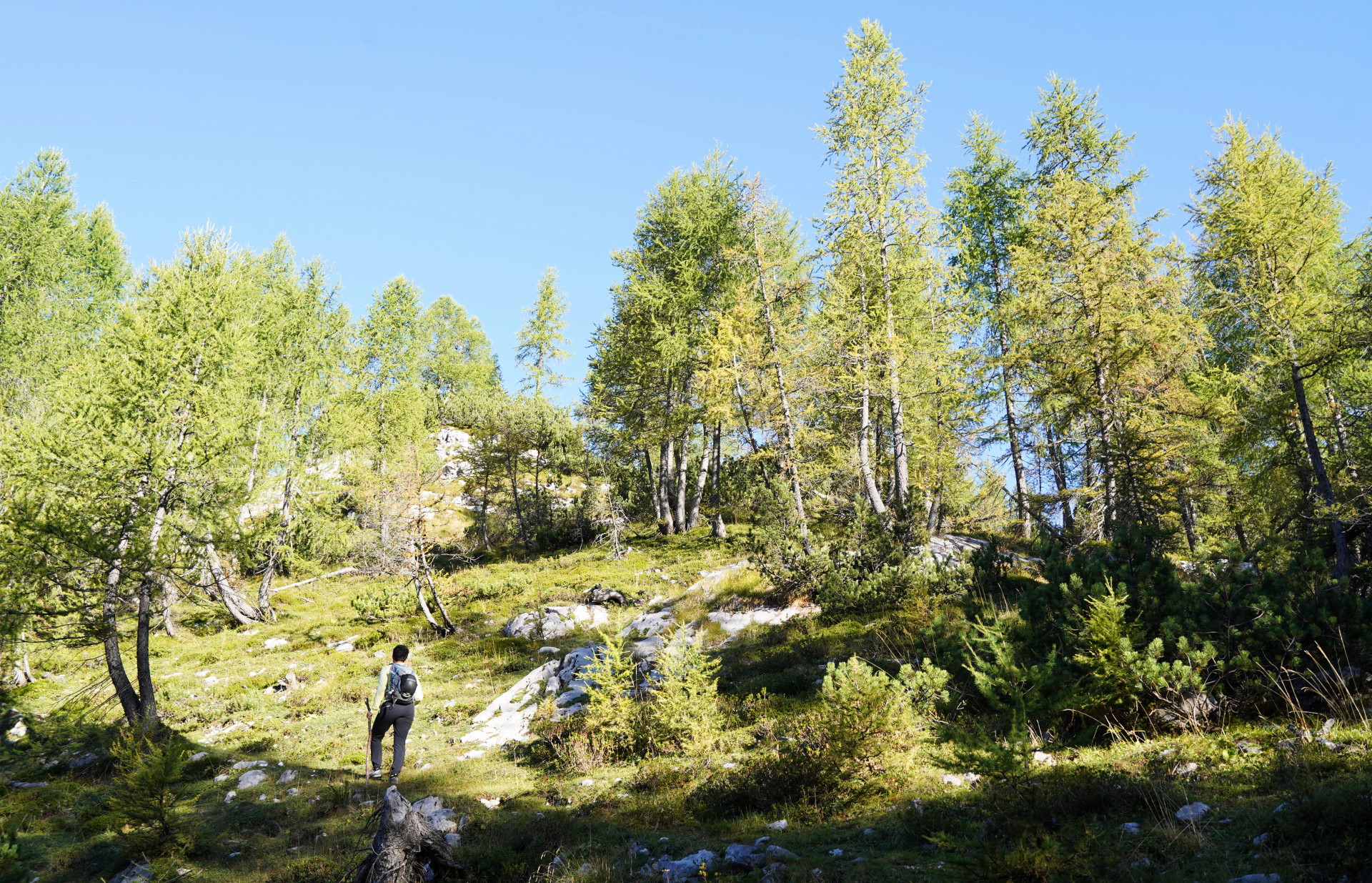 Na Malem polju sva zapustila markirano pot in se takoj znašla v idilični in samotni Travni dolini, kjer sva hitro pozabila vso slabo voljo. Tura je predvsem dolga: najprej po Krmi v eno smer, nato skozi Travno in višje Kravjo dolino v drugo smer do Temena, od tam do vrha Rjavine in po grebenu naprej visoko nad Krmo, spust nazaj do Travne doline – in seveda spet v obratni smeri navzdol. Skupaj skoraj 20 km. Še sreča, da je ves čas tako lepo. Med vzponom sva spoznala še eno pomanjkljivost: tudi konec septembra je lahko prevroče za to pot. In čeprav je bilo tudi v zahodnih Julijcih še celo dopoldne lepo vreme, sva bila na koncu prav zadovoljna z izbiro: manj vožnje in več hoje v prav tako lepih krajih.
