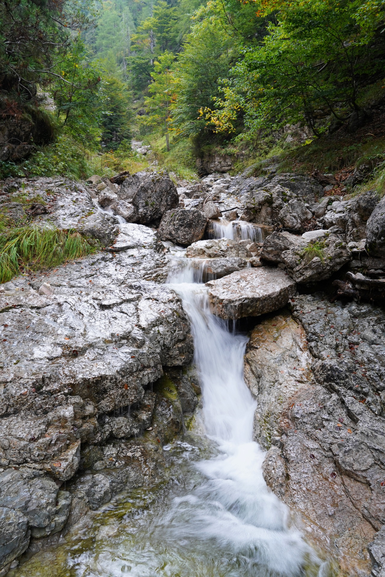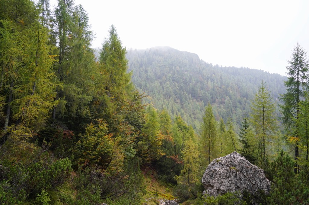 Lepo uhojena pot se takoj s ceste požene v strm gozd, ves čas nad potokom v globoki grapi Canale della Malga. Sprva sem bil še optimist, da se bo vreme izboljšalo in sem vzpon zavlačeval z občasnimi obvozi do živahnega potoka, na katerem je cela vrsta slapov – večina je žal vidna le od daleč. Kljub temu sem bil navdušen nad popestritvijo vzpona. Pri vodnem zajetju, že visoko v grapi, sem prestopil na desni breg. Pot naprej je slabše uhojena, v pomoč so možici in tudi zvok potoka, ki nikoli ni daleč. V bolj vodnatem obdobju je verjetno tudi zgoraj še več slapov. Višje pot zavije levo in kmalu pripelje iz gozda v slikovito krnico, obdano s stenami in že od daleč neprijetnimi grapami.